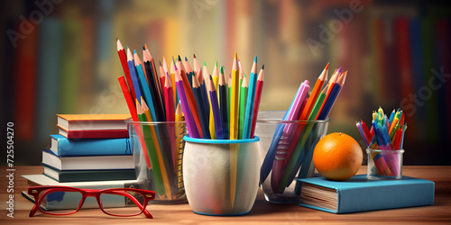 Back to school concept Group of school supplies paint pencils paper notepad on wooden table Ge