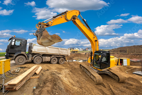 Bagger arbeitet auf einer Baustelle mit Erdarbeiten - FOTOMONTAGE