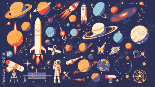 Big space set featuring planets, the sun, comet, meteorite, rocket, UFO, satellite, astronaut, black hole, shuttle, radar, the Big Dipper, telescope, nebula, galaxy, and Lunokhod. Vector flat illustr