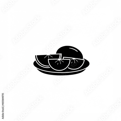 Black silhouette icon of a plate with a whole orange and slices.