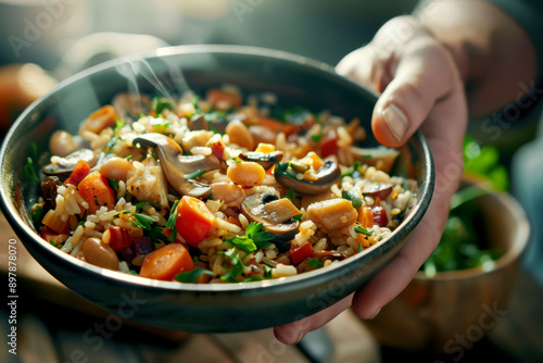 bowl of sizzling rice, sliced mushrooms. AI generative.