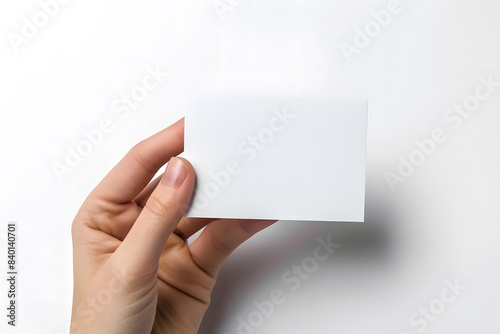 Business card mockup in woman's hand. Blank calling card template isolated on white background