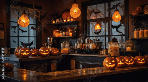 : Cafe interior decorated for Halloween with cobwebs, carved pumpkins, and themed drinks on the counter, warm cozy lighting.