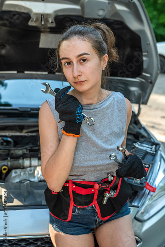 car broke down in the middle of the road and the owner of the car girl will repair it.