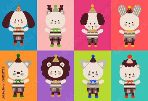 cartoon animal party card set . vintage style . happy holiday illustration kids set . with golden glitter elements decoration .