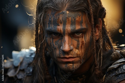 Character from a historical epic with battle scars and warrior makeup, Generative AI