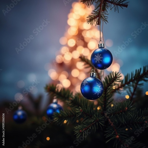 Christmas tree with ornaments in blue - baubles hanging on fir branches with glittering and bokeh lights in abstract defocused background christmas tree holiday winter festive celebration