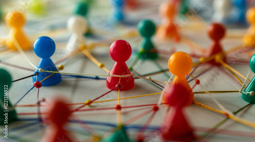 Close-up of colorful game pieces connected by strings, symbolizing networking, teamwork, and relationships in a playful setting..