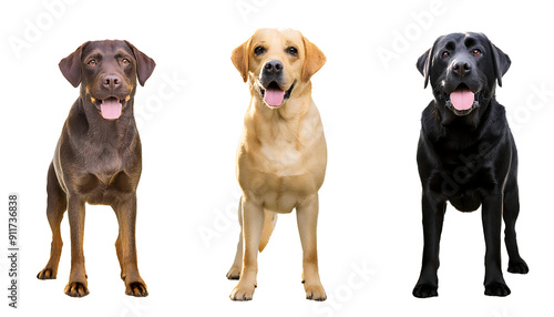 Collection of three happy standing labrador retriever dogs in different colours, yellow, bl_1(48)