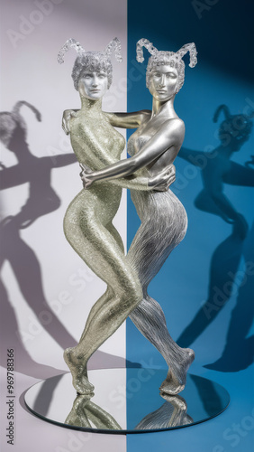 Contemporary representation of Gemini zodiac sign, featuring silver and gold intertwined twin female statues in a dance pose, reflecting light and balance, symbolizing duality and social energy