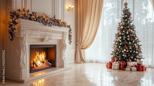 Cozy living room interior with decorated fireplace and christmas tree, festive holiday atmosphere with twinkling lights and seasonal decor, perfect for celebrating christmas traditions in a warm, inv