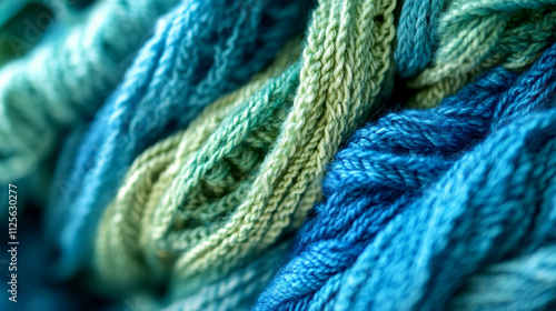 Crafting Comfort: Light Green Yarn and Metallic Blue Hook with Knitted Texture