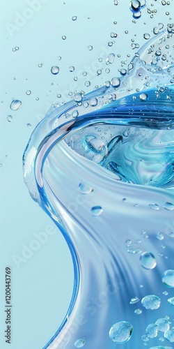 Crystal clear water splash with floating bubbles on blue background, refreshing and pure aquatic essence