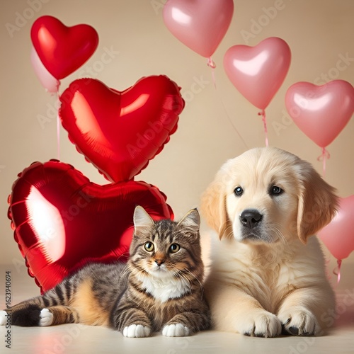 Cute Sweet Romantic Twin Dog Puppy and Cat Kitten Couple Animals Portrait with Valentine Love Heart Shaped Balloon Sitting Hugging Kissing Next to Each Other on Pink Background New Year Meow Ruff Bar