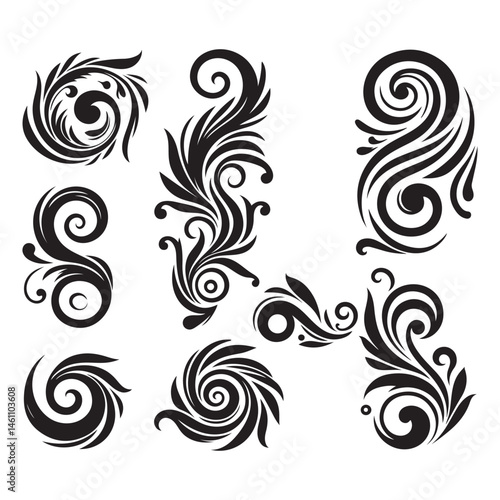 Decorative swirl and spiral vector silhouette set, Elegant shapes add a stylish touch to invitations, logos, tattoos,