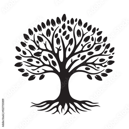 Decorative tree icon with roots. Abstract symbol for ecology, family, organic products, or company logo.
