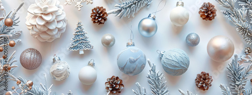 Delicate background of a winter holiday setting with frosty Christmas ornaments, pine trees, and shimmering decorations, offering a serene festive feel.
