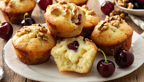 Delicious cherry muffins with walnuts and cream cheese ready to be savored