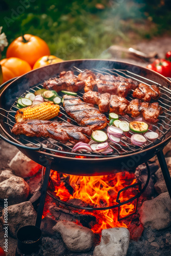 delicious grilled beef steaks on barbecue grill with flame. Good food. Picnic concept. Generative AI