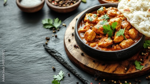 ** Delicious Indian Chicken Curry with Naan and Rice on Rustic Wooden Board Garnished with Fresh Cilantro and Spices..**