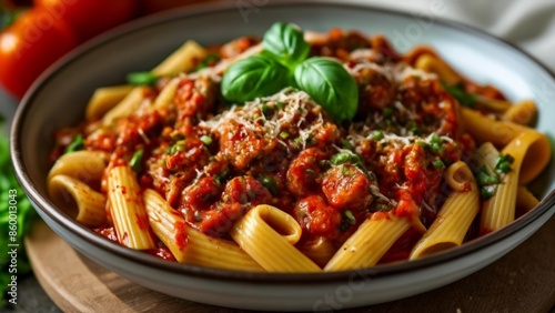 Delicious pasta dish with meat sauce and fresh basil