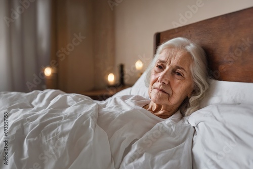 elderly woman, old woman lying in bed, sad humble mood, alone and lonely
