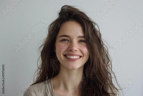 : Elegant dark brown-haired woman portrait on white background, highlighting wellness.