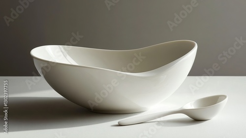 Elegant white porcelain bowl with a matching spoon beside it. A simple yet refined bowl with a smooth, curved shape is placed alongside a ceramic spoon.