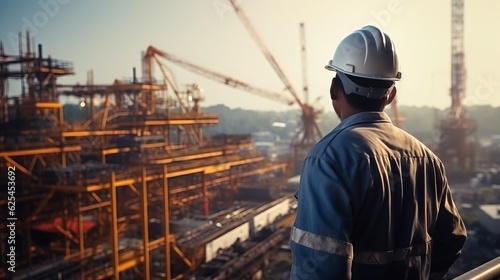 Engineer Technician Watching Team of Workers on High Steel Platform,