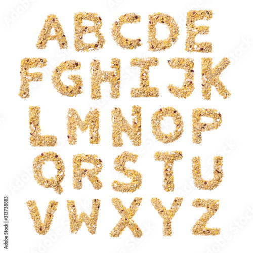 English alphabet muesli with coconut, berries, raisins, cereal and natural cereals on a white isolated background. Food pattern made from granola. bright alphabet for shops.