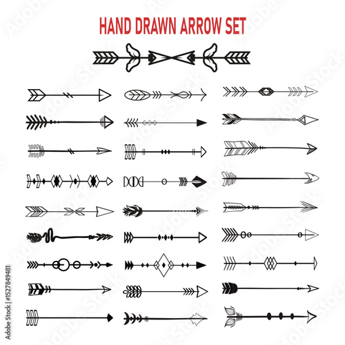 Extensive Hand Drawn Arrow Set: Diverse Black Line Art Arrow Collection - Illustrative Graphic Design Resource Sheet with Multiple Styles