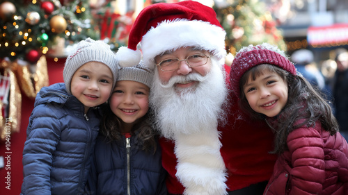 Father Christmas posing with Children in front of a holiday display happy