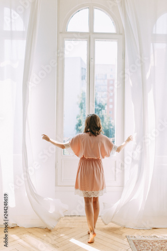 Fees and photo shoot in the interior Studio. Morning of the bride dress in the boudoir, in bed.