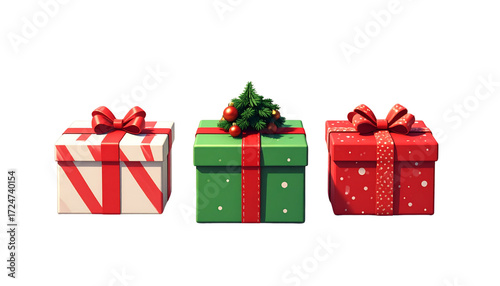 Festive Wrapped Present Trio Set in Holiday Styles, isolated on transparent background