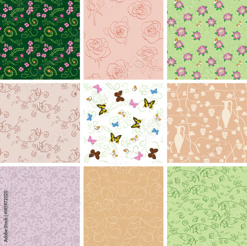 floral backgrounds with flowers and butterflies - vector seamless patterns