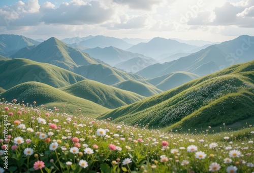 Floral Mountain Vista Soft and Gentle Depiction of Green Slopes Covered in Blossoming Flowers, with a Serene Atmosphere