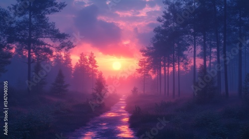 forest in dawn with a sky that is going from purple to blue