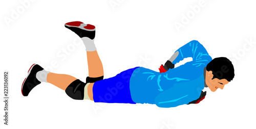 Foul situation, goalkeeper. Injured sportsman on field. Red card. Soccer player vector isolated on white background. High detailed football player cutout outlines.