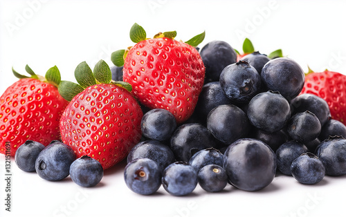 Fresh Mixed Berries – Juicy Strawberries and Blueberries on a Clean White Background, High-Resolution Food Photography with Vibrant Colors and Detailed Textures