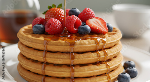 Freshly stacked golden waffles topped with strawberries, blueberries, and syrup, ideal for breakfast advertisements and cafe menus