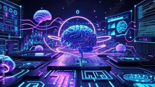 Futuristic AI Powered Digital background with Cybernetic Brain and Neon Tech Aesthetics