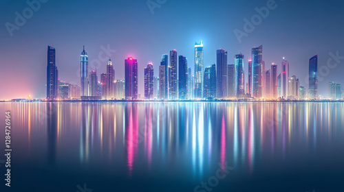 Futuristic Glow: Illuminated Skyline Reflected in a Digital Horizon