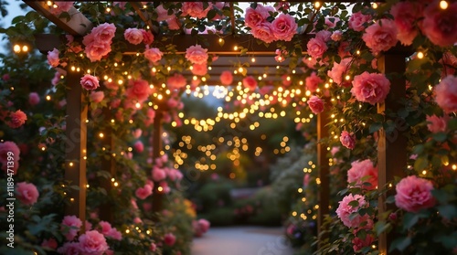 garden with pink flowers and strings of fairy lights illuminating the surroundings, creating a romantic and inviting atmosphere.