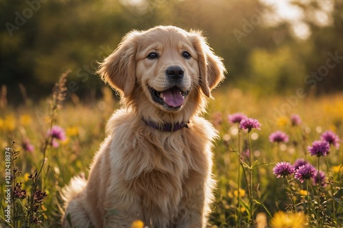 golden retriever puppy with bright eyes and a happy expression, sitting in a field full of colorful flowers. The soft sunlight enhances the warmth and beauty of the moment.