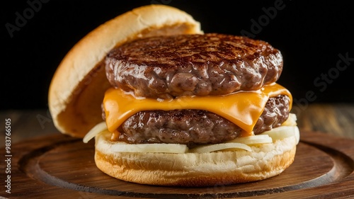 hamburger burger with beef, red onion, tomato and fried bacon.