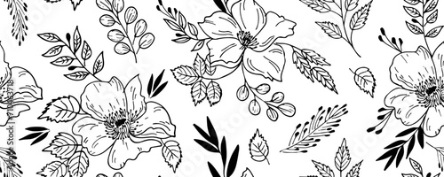 Hand drawn floral repeat ornament of blossoms in sketch style.