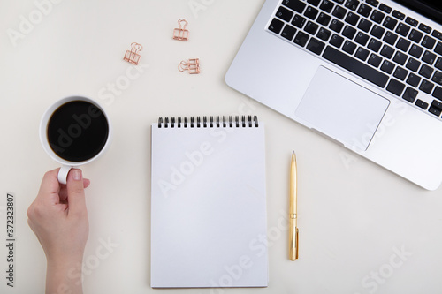hand holds a cup of coffee on a working light table next to a laptop and accessories. notepad, golden pen. Top view with copy space for text input.