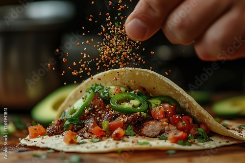 Hand sprinkling crispy jalapeños over fresh taco with slow-cooked meat and avocado slices. Spicy, flavorful topping adds texture to vibrant Mexican dish.