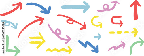 hand-drawn colorful bold brush curved and wavy arrows collection. Vector thick arrows.