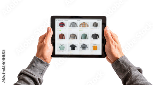 Hands Holding a Tablet with E-Commerce Product Listings on Transparent Background
